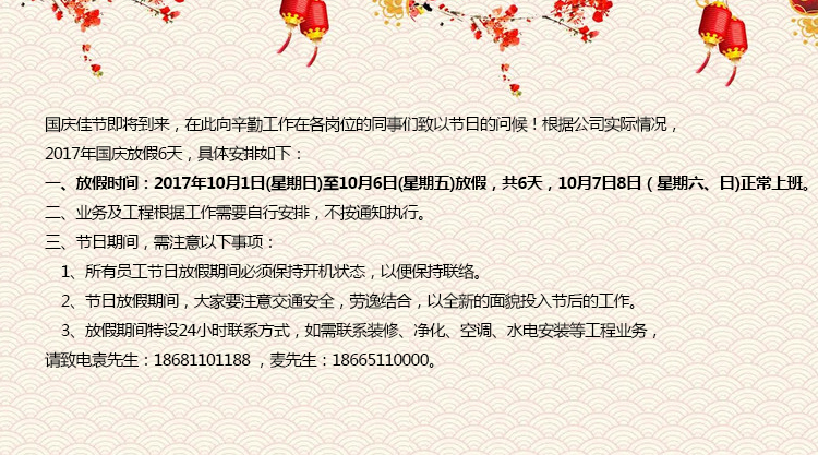 3、放假期間特設(shè)24小時聯(lián)系方式,如需聯(lián)系裝修、凈化、空調(diào)、水電安裝等工程業(yè)務(wù), 請致電袁先生:18681101188 ,麥先生:18665110000。